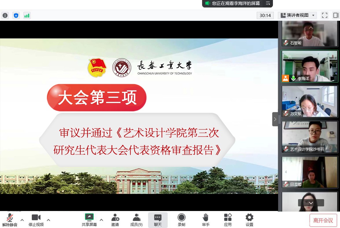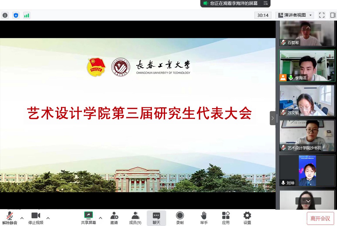 10月31日,艺术设计学院第三次研究生代表大会通过线上会议的方式举行。学院党委副书记刘坤以及9名研究生代表参加本次会议。大会由研究生辅导员助理苏文敏主持。