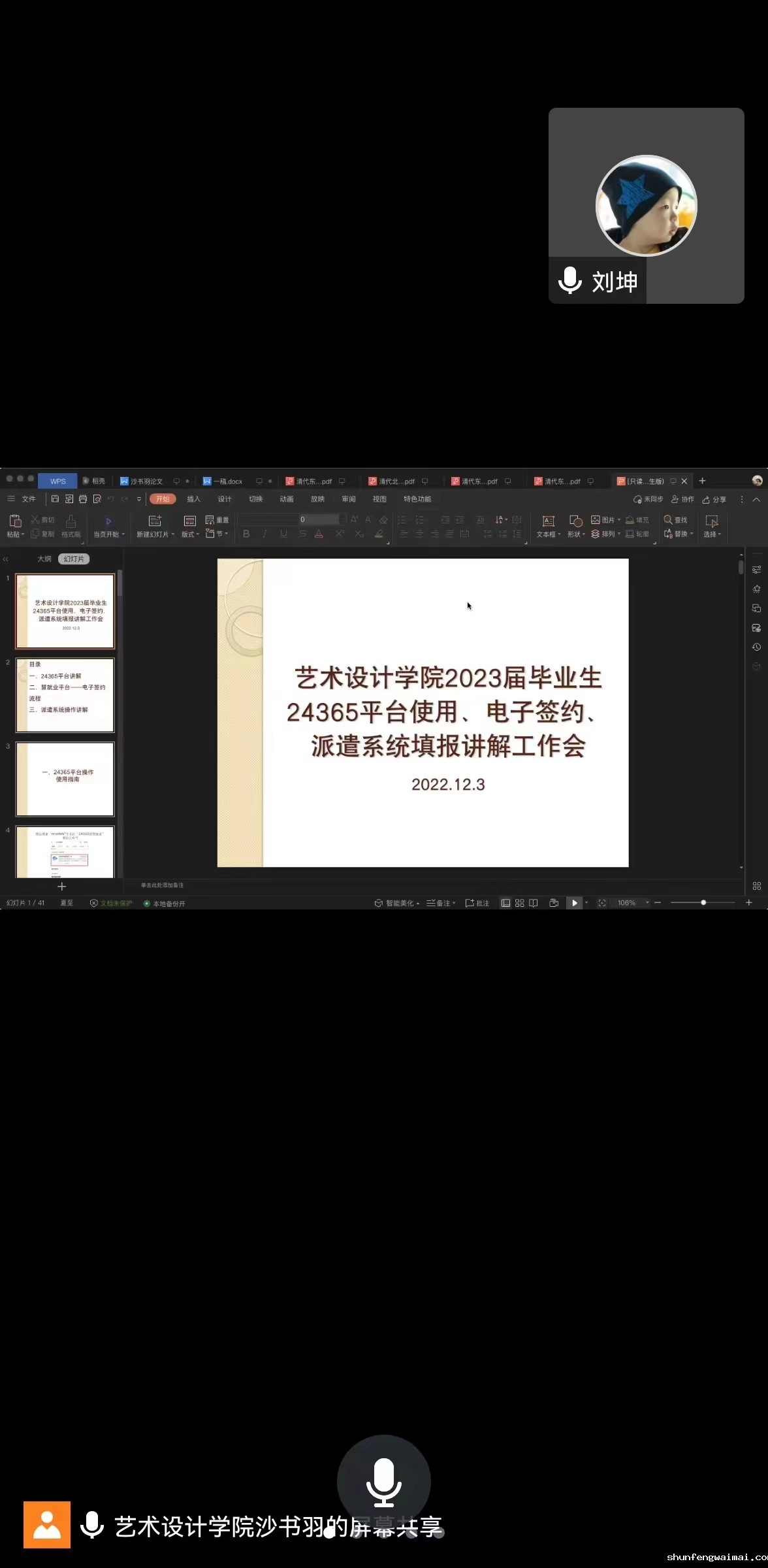 为进一步推动2023届毕业生就业工作,帮助应届毕业生了解就业形势,掌握就业签约和派遣相关操作流程,艺术设计学院于12月3日召开2023届毕业生就业指导线上会议,学院党委副书记刘坤、毕业班辅导员于丰硕主讲,全体2023届硕本毕业生参会。
