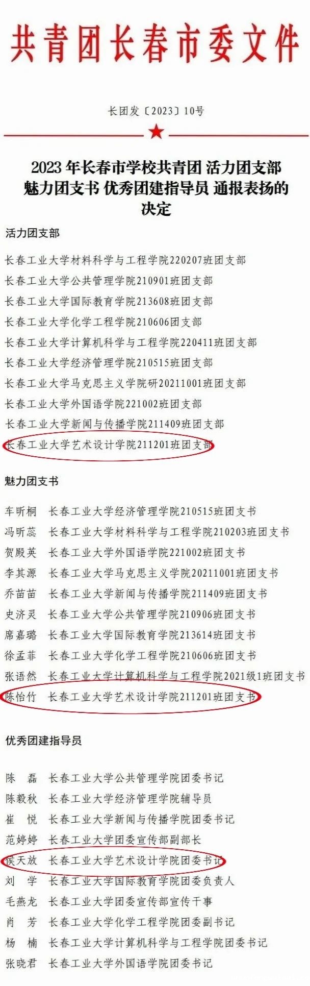 (通讯员 侯天放)在2023年长春市学校共青团 “活力团支部” “魅力团支书” “优秀团建指导员”评选中,学院211201班被评为活力团支部,211201班团支书陈怡竹被评为魅力团支书、学院团委书记侯天放被评为优秀团建指导员!